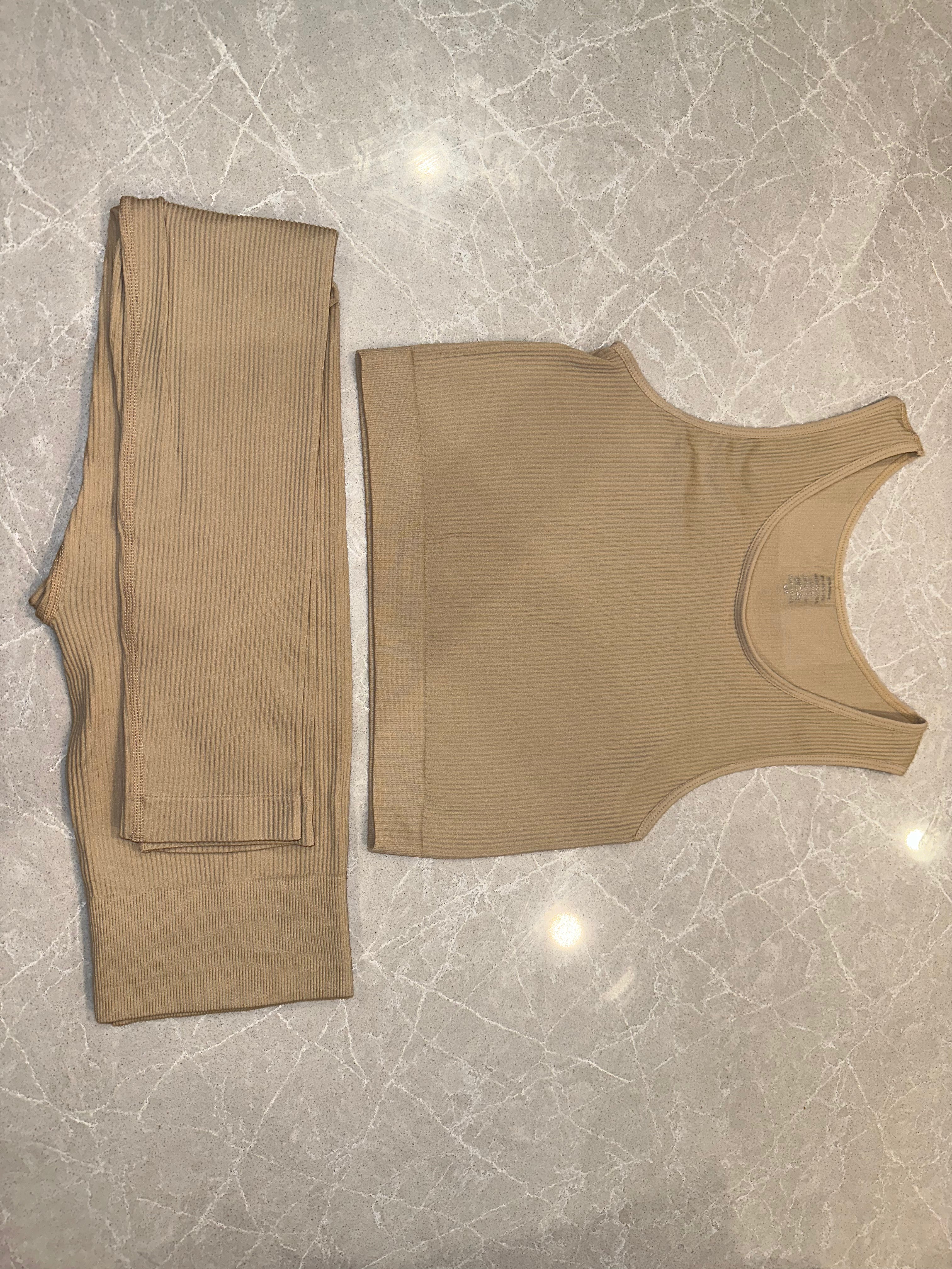 Two-piece seamless race back top and high waisted leggings set.
